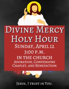 This Sunday, April 12, celebrate Divine Mercy with a special Holy Hour at 3:00 p.m. There will be Adoration, the praying of the Divine Mercy chaplet, and opportunities for Confession. All are welcome!