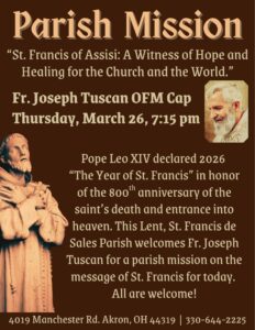 This year, Bishop Malesic is asking that every parish participate in the Diocesan Week of Service from March 22-28. He wrote this…“Dear Brothers and Sisters in Christ, some time ago, I wrote you a pastoral letter entitled ‘A Flourishing Apostolic Church.’ It was there that I asked you to follow a pastoral blueprint to examine the ways we worship, evangelize, and serve. Today, I am inviting you to consider putting the third leg of this blueprint into action by taking part in the Diocesan Week of Service from March 22-28, 2026. Parishes, schools, and Catholic organizations are invited to host a service opportunity during the Week of Service. You know the needs of your community better than we do, so we are asking you to design a project that suits the needs of your local community.”